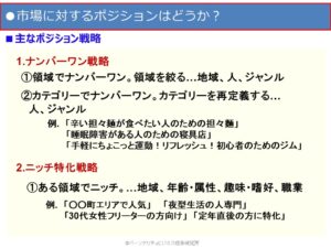 なので、この③の「市場に対するポジションはどうか」とは、つまり、「ナンバーワン戦略が取れているかどうか」、ということです。