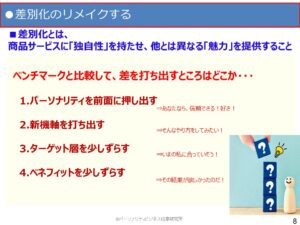 まず、一つ目の「差別化をリメイクする」ですが、そもそも、「差別化」とは、他と比較したときの優位性のことです。