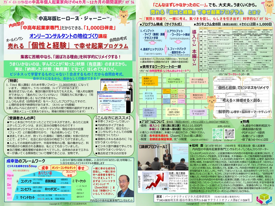 なぜ、中高年個人起業家は、①.資格もスキルもあるのに ②.成功者のノウハウを真似しても ③.起業の塾や講座などで学んでもうまくいかないのでしょうか? それは、学んだやり方や知識を(誰かの答えを)、自分のやり方や認識に(自分の答えに)変換できていないからです。つまり、自分ゴトになっていない(肚落ちしていない)からうまくいかないのです。なので、頭と(顕在意識)と心(潜在意識)にズレが発生してしまうのです。すると、行動できない、行動してもうまくいかない、ということが起こります。でも、大丈夫。メソッド「自問自考力Ⓡ」によって、自分のパーソナリティ(個性、経験)を再発見し、魅力(独自性)を磨いて、「自分の答え」つくっていけばいいのです。それは、科学的(心理学的×脳科学的)なアプローチでもあります。そして、もし、まだ自分のパーソナリティ(個性、経験)に氣づかずにビジネスをしているとしたら、あなたの「伸びしろ(素質資質)」は眠ったままになっているのです! 集団行動が苦手なあなたも1to1個人講座ならその能力が発揮できます! 私と一緒に、中高年個人起業家が元気な社会にしていきましょう!大まかなポイント次の4つ。①あなたの売れる「個性と経験」を見つける→②コンセプトとコンサル型高単価商品をつくる→③自然体でに売れる集客導線をつくる→④認知~ファンを増やす発信(発振)を実践する。そして、オンリーコンサルタントとしての役職(お役立ち)づくり、地位(ポジショニング)づくりが出来上がります。〔⇒このような一連のストーリーを『中高年起業版ヒーローズジャーニー™』と呼んでいます〕